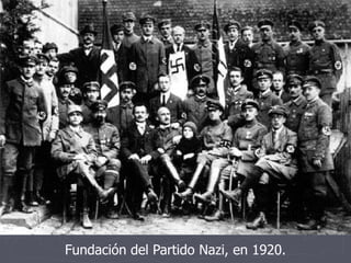 El documento resume el ascenso del partido nazi en Alemania desde su fundación en 1920 hasta que Hitler se convirtió en dictador en 1934. Detalla los intentos de golpe de estado de Hitler en 1923, su encarcelamiento donde escribió Mein Kampf, y su elección como Canciller en 1933 después de que los nazis ganaran las elecciones de 1932. Una vez en el poder, Hitler estableció una dictadura, disolvió otros partidos políticos y comenzó la persecución sistemática de los judíos y otros grupos.