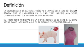 La neurocisticercosis es una infección del sistema nervioso central causada por la larva del cestodo Taenia solium. Los síntomas dependen de la localización y estado de los quistes en el cerebro, y pueden incluir convulsiones, cefalea y alteraciones neurológicas. El diagnóstico se basa en la combinación de hallazgos clínicos, de neuroimagen y pruebas inmunológicas. El tratamiento inicial consiste en controlar los síntomas como las convulsiones y la presión intracraneal elevada, seguido de