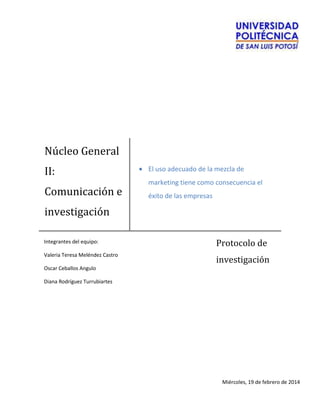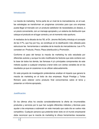 Este documento describe un proyecto de investigación que analiza el impacto de la mezcla de marketing en el éxito de dos empresas, Royal Prestige y Tortas Richard. La investigación utilizará encuestas y entrevistas para comprender cómo estas empresas usan las 4 P's de la mezcla de marketing (producto, precio, plaza y promoción) y cómo esto contribuye a su crecimiento y reconocimiento.