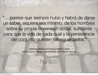 El documento repite la fecha "jueves 3 de abril de 14" varias veces y también contiene algunas palabras sueltas o frases cortas como "working for new", "creando", "social business" y "nur&co", pero no proporciona ninguna información clara o narrativa sobre un tema en particular.