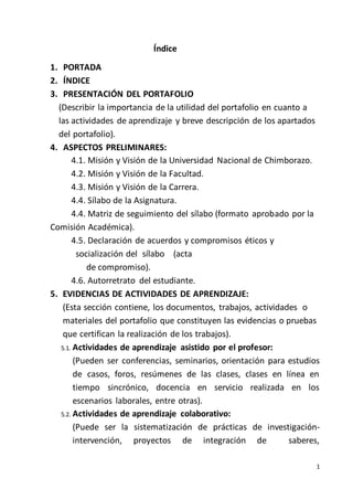 Este documento presenta un modelo de portafolio académico que consta de 11 secciones principales. La primera sección describe la importancia del portafolio y resume sus apartados. Las siguientes secciones detallan la misión y visión de la universidad, facultad y carrera, así como el sílabo de la asignatura. Otras secciones incluyen evidencias de actividades de aprendizaje, autoevaluación, coevaluación y heteroevaluación.