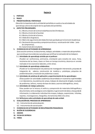 Este documento presenta un índice detallado para un portafolio de estudios. La introducción describe la importancia del portafolio para documentar las actividades de aprendizaje. La sección de evidencias contiene trabajos y materiales que demuestran la realización de tareas. Estas incluyen actividades guiadas por el profesor, colaborativas, prácticas, y autónomas como lecturas e investigaciones. La sección de evaluación cubre instrumentos de autoevaluación y coevaluación. Anexos y una sección de sugerencias completan el