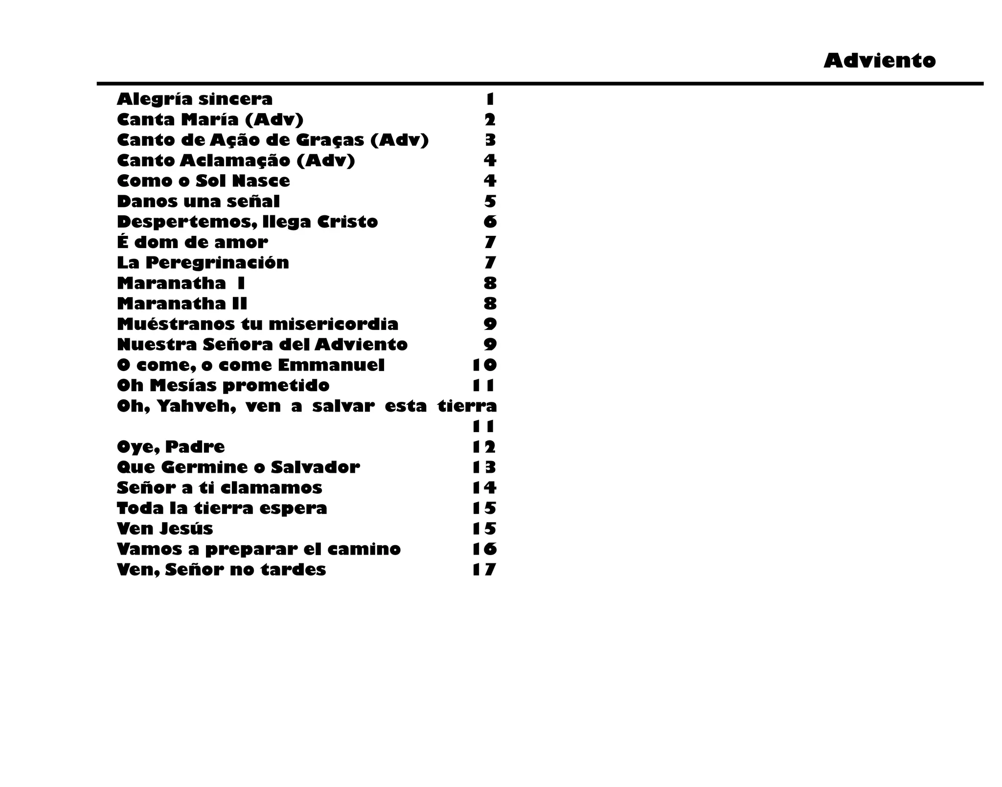 Este documento contiene 17 títulos de canciones relacionadas con el Adviento, una temporada litúrgica de preparación para la Navidad en el cristianismo. Algunas de las canciones mencionadas incluyen "Canta María", "Danos una señal", y "O come, o come Emmanuel".