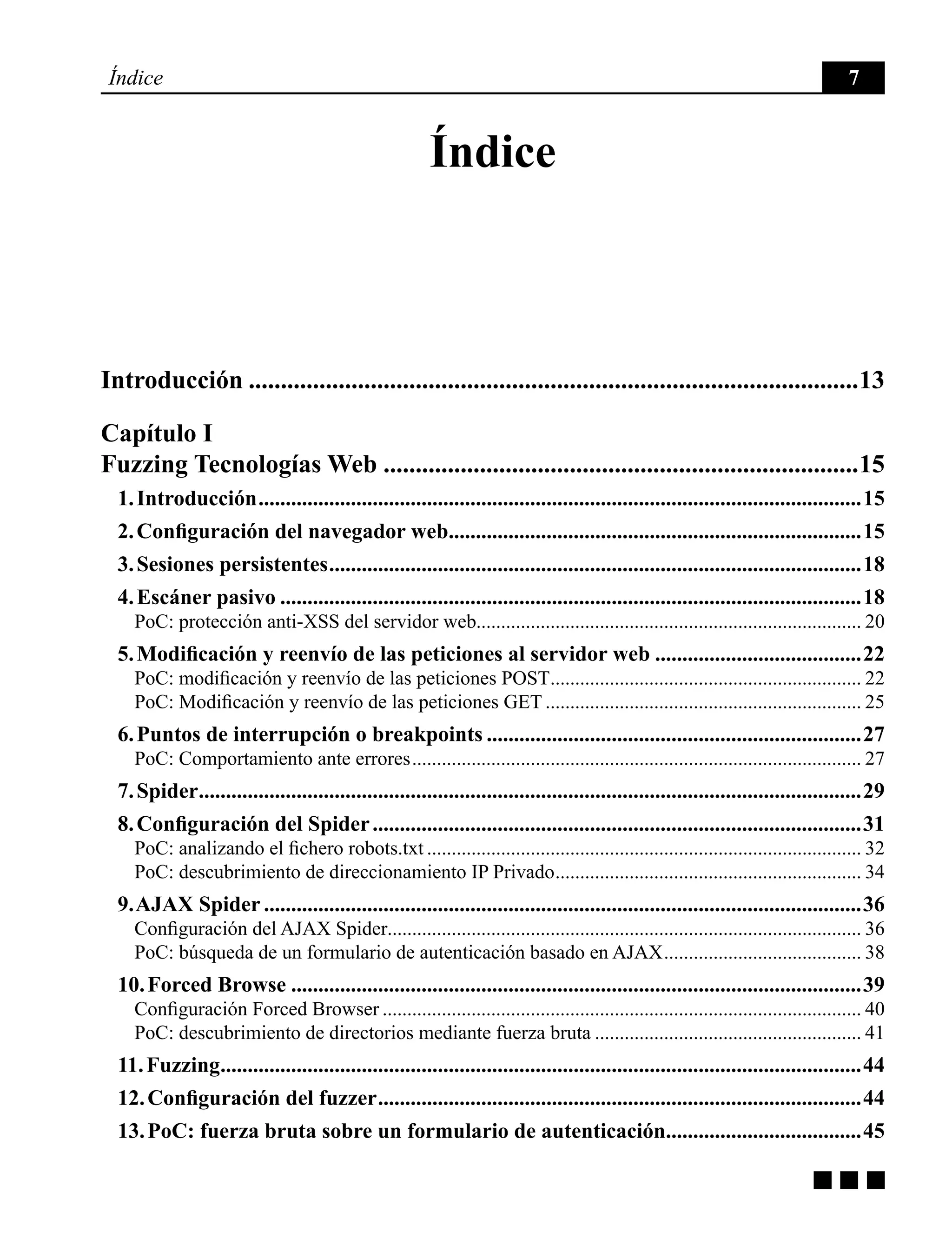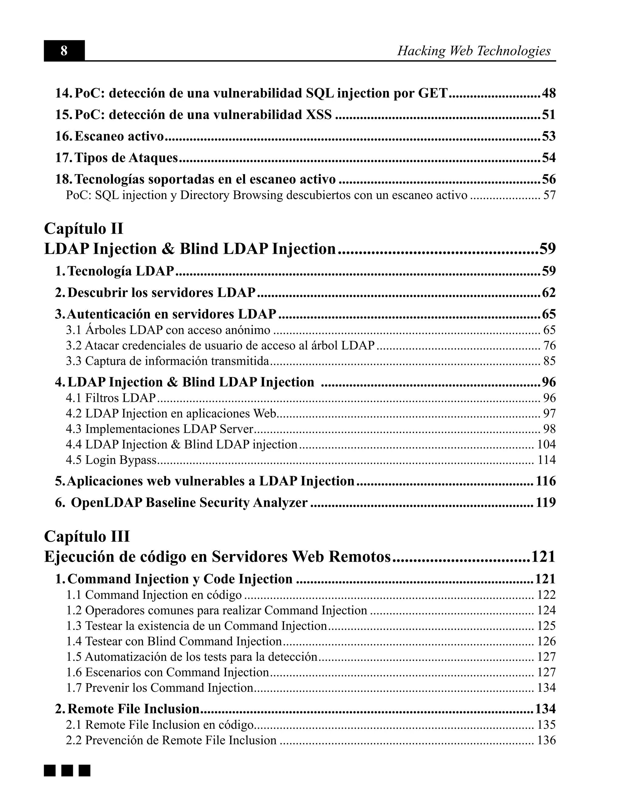 El documento aborda diversas técnicas de hacking y sus respectivas contramedidas, centrándose en temas como fuzzing, inyección LDAP, inyección de código remoto y ataques a cadenas de conexión. Cada capítulo presenta métodos de explotación, pruebas de concepto (PoC) y estrategias para prevenir vulnerabilidades. Se incluye un análisis exhaustivo sobre tecnologías web y sus debilidades, provechando ejemplos y recomendaciones para mejorar la seguridad.
