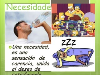 Este documento clasifica las necesidades, bienes y servicios. Las necesidades se clasifican según si surgen del individuo o la sociedad, si son primarias o secundarias, y si se satisfacen con bienes o servicios. Los bienes se clasifican según las necesidades de consumo, el nivel de elaboración y su relación entre ellos. Los servicios son actividades que responden a las necesidades del cliente, y se clasifican como públicos o privados, de mantenimiento, reparto, arriendo o talleres. Los servicios se caracterizan por ser intangibles