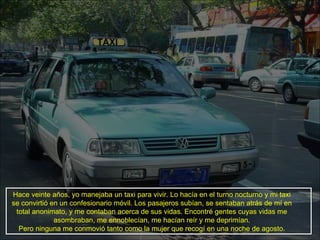 El documento resume la experiencia de un taxista que recogió a una anciana mujer una noche para llevarla a un asilo de ancianos. A pesar de la hora tardía y el lugar aislado, el taxista decidió ayudar a la mujer. Durante el viaje de dos horas, la mujer le mostró lugares importantes de su vida pasada y compartió que ya no le quedaba mucho tiempo. Al dejarla en el asilo, la mujer le pidió un abrazo, reconociendo la gentileza del taxista. Aunque fue un momento pequeño, el taxista reflexiona sobre cómo