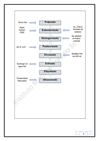 El documento describe el proceso de elaboración de néctar de guanábana. Incluye las etapas de recepción de materia prima, selección, pelado, licuado, pulpeado, estandarización con agua, azúcar y otros ingredientes, homogenizado, pasteurizado, envasado, enfriado, etiquetado y almacenamiento. Explica cada etapa con detalle y proporciona fórmulas y porcentajes para añadir los ingredientes correctos.
