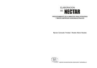 El documento presenta información sobre la elaboración de néctares, incluyendo los materiales, equipos y procesos necesarios. Describe las etapas de selección y lavado de la fruta, precocción, pelado, pulpeado, refinado, estandarización con agua, azúcar, ácido cítrico y otros insumos, homogenización, pasteurización, envasado y almacenamiento. El objetivo es brindar los conceptos básicos para que pequeñas empresas puedan elaborar néctares de manera segura y de calidad.
