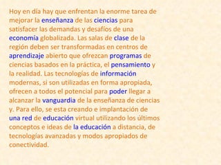 Este documento discute la necesidad de mejorar la enseñanza de las ciencias para satisfacer las demandas de una economía globalizada a través del uso de tecnologías de información modernas y la creación de una red de educación virtual. También destaca cómo las nuevas tecnologías están transformando la sociedad y los procesos educativos, y cómo la globalización ha cambiado la concepción de la educación.