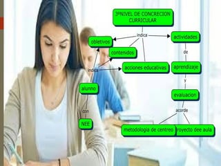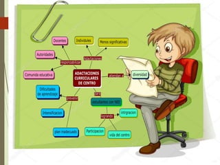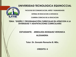 El documento aborda el diseño y programación curricular enfocado en la atención a la diversidad en la educación. Destaca la importancia de adaptar currículos a las necesidades individuales de los estudiantes y propone modalidades de apoyo y seguimiento familiar. Se incluyen estrategias para la implementación y evaluación de adaptaciones curriculares específicas.