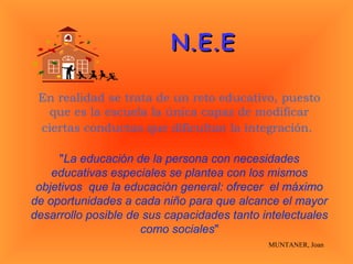 La integración escolar implica educar juntos a niños con y sin discapacidad. Es un proceso gradual que toma diferentes formas dependiendo de las habilidades de cada niño. La escuela juega un rol clave al modificar conductas que dificultan la integración. Tanto niños con necesidades especiales como los demás deben tener las máximas oportunidades para desarrollar sus capacidades. Esto puede requerir adaptaciones a objetivos, contenidos, metodología, evaluación y otros elementos curriculares.