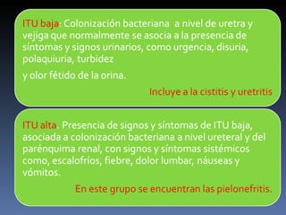 La infección del tracto urinario es causada principalmente por Escherichia coli y afecta a millones de personas cada año. Puede presentarse como cistitis, pielonefritis o prostatitis agudas, siendo la cistitis la forma más común. El tratamiento incluye medidas generales como beber abundantes líquidos así como antibióticos para tratar la infección de forma específica.