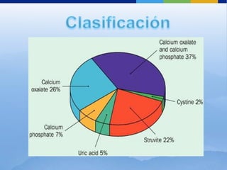 La litiasis renal o nefrolitiasis se caracteriza por la formación de cálculos en el aparato urinario superior. Puede causar cólico nefrítico, una urgencia médica dolorosa. Los cálculos se forman cuando la orina está sobresaturada con respecto a sus cristales constituyentes. El diagnóstico incluye radiografías, ecografías y urografías. El tratamiento busca aliviar el dolor, facilitar la expulsión del cálculo y prevenir complicaciones y recidivas.
