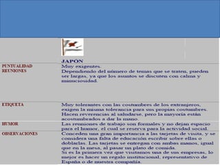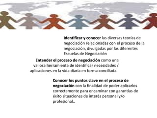1) El documento presenta información sobre negociación internacional, incluyendo los principios a seguir en una negociación internacional como adoptar un enfoque de ganador-ganador y conocer las diferencias culturales.