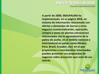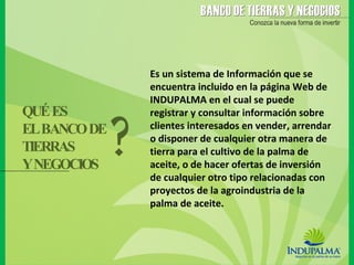El documento describe el Banco de Tierras y Negocios de INDUPALMA, un sistema de información en su página web que facilita el acercamiento entre propietarios de tierras, inversionistas e INDUPALMA para el desarrollo de proyectos relacionados con la palma de aceite. Los propietarios e inversionistas interesados deben registrarse en el sistema, completar una ficha técnica con información sobre sus tierras/proyectos, y firmar un contrato con INDUPALMA para publicar la información por seis meses.