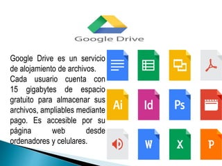 El documento compara varios servicios de almacenamiento y compartición de archivos en la nube como Google Drive, Dropbox, LinkedIn, Facebook, Twitter y SlideShare, describiendo brevemente los propósitos y capacidades de cada uno.