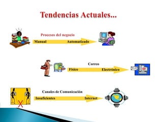 El documento describe las tendencias actuales en los canales de comunicación, comercio y capacitación, pasando del formato tradicional físico a uno más automatizado y electrónico aprovechando Internet. También se resumen conceptos como la importancia del conocimiento del cliente, los negocios electrónicos, clasificaciones como B2C, B2G, e-commerce, y tipos de aplicaciones como ERP, CRM y SCM.