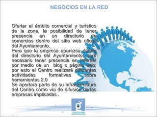 El proyecto Guadalinfo Negocios en la Red busca ofrecer a empresas comerciales y turísticas de Salobreña la posibilidad de tener presencia en un directorio en el sitio web del Ayuntamiento. Para estar en el directorio, las empresas deben tener presencia en Internet a través de un blog o página web. El Centro Guadalinfo ofrecerá capacitaciones sobre herramientas digitales para ayudar a las empresas. El proyecto involucra al Ayuntamiento, asociaciones empresariales y el Centro Guadalinfo. Se desarrollará