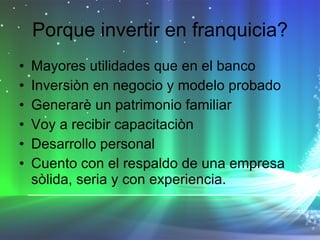 El documento ofrece consejos sobre invertir en una franquicia. Menciona algunas ventajas como mayores utilidades que en el banco, invertir en un negocio y modelo probado, y recibir capacitación y apoyo de una empresa establecida. También describe el perfil deseable de un franquiciatario, como seguir las reglas del modelo de negocio, trabajar en equipo, y respetar la confidencialidad. Aconseja analizar tus preferencias, investigar a la empresa, y pedir información clara sobre aspectos financieros y operativos antes