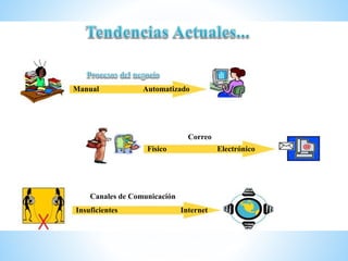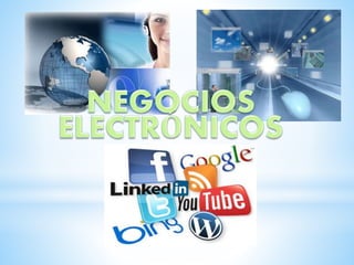 El documento presenta información sobre diferentes temas relacionados con los negocios electrónicos y el comercio digital. Explica la importancia del conocimiento del cliente, las clasificaciones de los negocios electrónicos (B2C, B2G), los tipos de aplicaciones como E-CRM, E-commerce y E-SCM. También describe los pasos para implementar un plan de negocios electrónicos, incluyendo el análisis de mercado, la definición de la cadena de valor y la selección de iniciativas digitales.