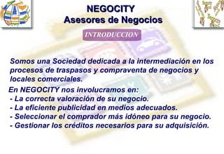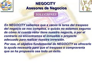 NEGOCITY es una sociedad dedicada a la intermediación en la compraventa y traspaso de negocios y locales comerciales. Ofrecen servicios de valoración, publicidad, selección de compradores idóneos y gestión de créditos para facilitar con éxito la adquisición o traspaso de un negocio. También presentan varios negocios en venta, como bares, restaurantes, spas y salones de juegos.
