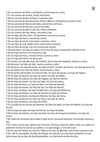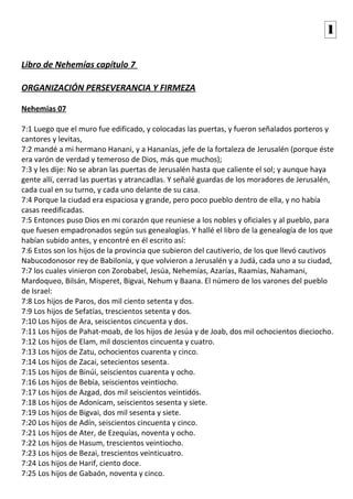 Nehemías organizó la protección de Jerusalén asignando guardias a las puertas de la ciudad y encargando a su hermano Hanani y a Hananías, jefe de la fortaleza, la supervisión de la seguridad, ya que eran hombres fieles a Dios. Luego registró a la población según sus genealogías y encontró que había 42,360 habitantes, excluyendo siervos, y organizó a los sacerdotes, levitas y otros grupos para que vivieran en sus ciudades.