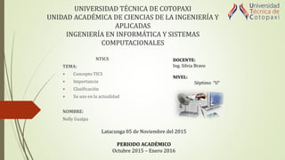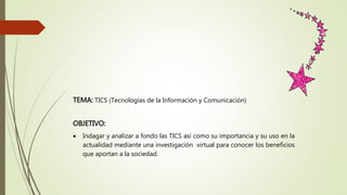 El documento resume el concepto, importancia, clasificación y uso actual de las Tecnologías de la Información y Comunicación (TICs). Define las TICs como la tecnología relacionada con la informática, internet y telecomunicaciones. Explica que las TICs son importantes porque permiten el manejo y desarrollo de la información y comunicación. Además, clasifica las TICs en procesamiento de datos, comunicación, fines educativos, publicación y transmisión de información, y fines comerciales u otros. Finalmente, señala que actual