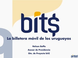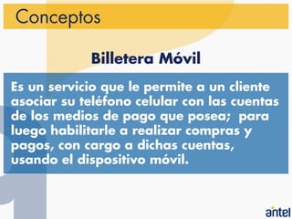 El documento describe una propuesta para lanzar una billetera móvil en Uruguay llamada "bit$" que permitiría a los usuarios realizar pagos y compras usando su teléfono celular y cargando los pagos a cuentas bancarias u otros medios de pago existentes. El objetivo es ofrecer una alternativa al uso de efectivo que sea sencilla, segura y atractiva para usuarios y comercios. La billetera móvil estaría disponible a partir de enero de 2012 y permitiría servicios como recarga de prepago, estacion