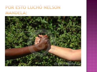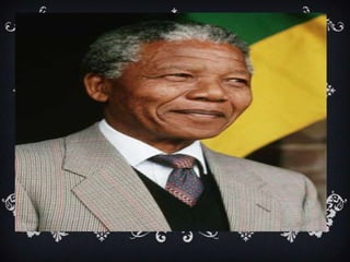 Nelson Mandela nació en 1918 en Sudáfrica. Estudió derecho y se convirtió en abogado. Luchó por los derechos de los negros y fue arrestado en 1962, siendo condenado a cadena perpetua. Pasó 27 años en prisión. En 1990 fue liberado y lideró las negociaciones para establecer una democracia multirracial en Sudáfrica, sirviendo como el primer presidente negro del país entre 1994 y 1999.