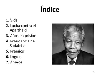 Este documento proporciona información biográfica sobre Nelson Mandela. Detalla su lucha contra el apartheid en Sudáfrica, sus 27 años en prisión, y su posterior presidencia de Sudáfrica, convirtiéndose en el primer presidente negro del país. También menciona algunos de sus logros más destacados como ganar el Premio Nobel de la Paz en 1993.