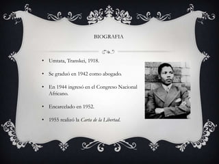 Este documento presenta una biografía y obra de Nelson Mandela. Resume que Mandela nació en 1918 en Sudáfrica, se convirtió en abogado en 1942 y se unió al Congreso Nacional Africano en 1944, por lo que fue encarcelado en 1952 y condenado a cadena perpetua en 1964 por su lucha contra el apartheid. Fue liberado en 1990 y se convirtió en el primer presidente negro de Sudáfrica en 1994. El documento también lista sus obras más importantes y los numerosos premios que recibió por su defensa de los derechos humanos.