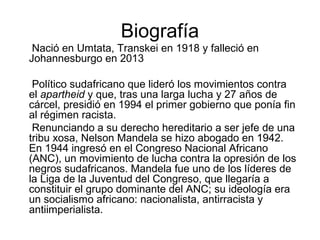 Nelson Mandela (1918-2013) fue un político sudafricano que lideró la lucha contra el apartheid y se convirtió en el primer presidente negro de Sudáfrica. Pasó 27 años en prisión por oponerse al régimen racista antes de ser liberado en 1990. Tras su liberación, asumió el liderazgo del Congreso Nacional Africano y ganó las primeras elecciones democráticas de Sudáfrica en 1994, convirtiéndose en el primer presidente elegido por sufragio universal. Mandela falleció en 2013 a los 95 años de