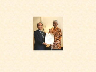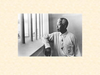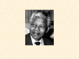 Nelson Mandela nació en 1918 en Sudáfrica. Se unió al Congreso Nacional Africano en 1944 para luchar contra la opresión de los negros y se convirtió en uno de sus líderes. Fue encarcelado durante 27 años por su oposición al apartheid, pero tras su liberación en 1990 se convirtió en el primer presidente negro de Sudáfrica, ganando las primeras elecciones democráticas multiraciales en 1994. Bajo su presidencia se buscó la reconciliación nacional y la construcción de una sociedad sin discriminación.