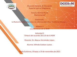 El documento presenta un resumen del Acuerdo 201119 de la Nueva Escuela Mexicana. Se implementará la asignatura de Tecnología para los grados 1ro a 3ro de secundaria a partir del ciclo escolar 2019-2020. El Acuerdo entrará en vigor al día siguiente de su publicación en el Diario Oficial de la Federación y deroga disposiciones administrativas opuestas. La SEP emitirá modificaciones a los Lineamientos para el desarrollo y ejercicio de la autonomía curricular.