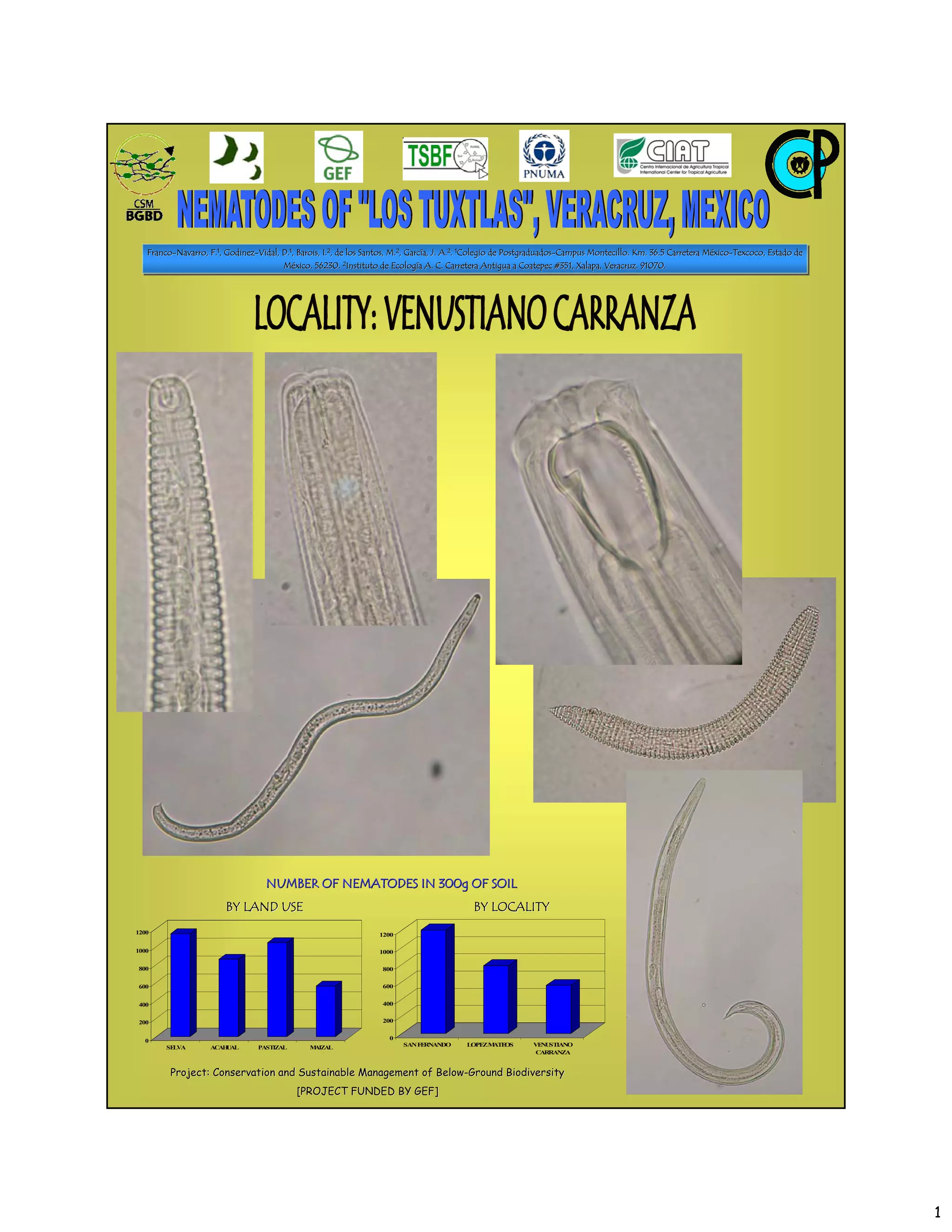 El documento presenta los resultados de un proyecto financiado por el FMAM sobre la conservación y manejo sostenible de la biodiversidad del suelo. Muestra gráficas del número de nematodos encontrados en 300 gramos de suelo por uso de suelo y localidad, con mayores cantidades en selva y menor en maizal. Los sitios con mayor número de nematodos fueron San Fernando y López Mateos.