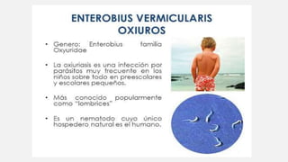 Este documento describe varios tipos de nematodos o gusanos redondos parásitos, incluyendo Ascaris lumbricoides, Anquilostoma duodenalis, y Trichuris trichura. Provee detalles sobre las características únicas y generales de los nematodos, como su forma cilíndrica alargada, dimorfismo sexual, y sistema digestivo completo. Luego, se enfoca en detallar la anatomía y ciclo de vida del Ascaris lumbricoides, un parásito común del ser humano.