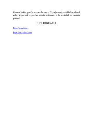 El documento describe la gestión educativa en la República Dominicana. Define la gestión como el conjunto de acciones para cumplir la misión de una institución educativa. Explica que una buena gestión genera beneficios como la motivación del personal, un buen clima institucional, eficiencia en el uso de recursos, y mejor rendimiento. También señala que la gestión en los últimos años se ha convertido en la mejor forma de dirigir los centros educativos para funcionar mejor con los recursos disponibles e integrar a toda la comunidad educativa.