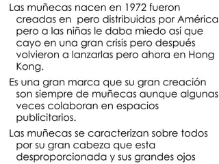Este documento resume las características clave de las muñecas Neo Blythe. Se destaca que fueron creadas en 1972 y distribuidas originalmente en Estados Unidos y América, aunque luego su distribución se trasladó a Hong Kong. Las muñecas se caracterizan principalmente por sus grandes cabezas y ojos. A diferencia de Barbie, Neo Blythe no tiene novio asignado, lo que ha permitido una gran cultura de personalización entre sus fans.
