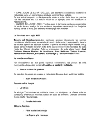 El neoclasicismo fue una corriente literaria que se desarrolló en Europa, especialmente en Francia, entre el siglo XVIII y principios del XIX. Exaltaba la antigüedad clásica grecorromana y predominaba la razón por sobre las emociones. En Hispanoamérica acompañó las luchas por la independencia y defendió el equilibrio frente al estilo barroco colonial. Algunos de sus rasgos incluyeron el patriotismo, la revalorización de lo americano y la intención didáctica a través de gé