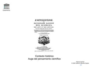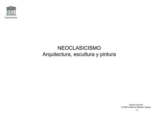 El documento proporciona información sobre varias obras arquitectónicas y escultóricas del neoclasicismo, incluyendo obras de Juan de Villanueva como la Casita del Príncipe, el Observatorio Astronómico y el Museo del Prado, así como esculturas de Antonio Canova como Dédalo e Ícaro, Teseo y el Minotauro y Las Tres Gracias. También analiza cuadros de Jacques-Louis David como El Juramento de los Horacios y El Juramento de la Pelota.