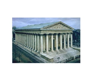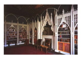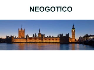 Este documento describe los estilos arquitectónicos neoclásico y neogótico, incluyendo sus orígenes y características principales. El neoclasicismo surgió en el siglo XVIII como reacción al barroco y rococó, inspirándose en el arte griego y romano antiguo. Prefiere formas simples, equilibradas y universales sobre lo individual. El neogótico, por su parte, revivió formas góticas medievales en el siglo XIX, como se ve en catedrales, iglesias y edificios públicos de