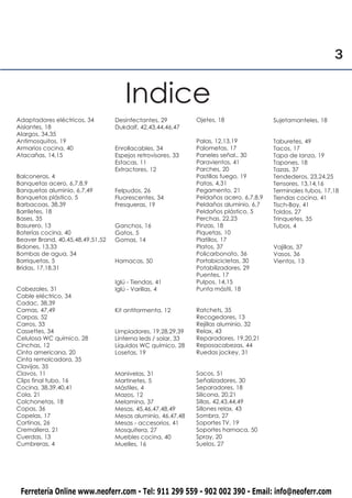 Este documento es un catálogo general de accesorios para camping y caravanismo. Incluye una lista de productos como mástiles, banquetas, piquetas, gatos y borriquetas de diferentes medidas y materiales como acero, aluminio y plástico. El catálogo contiene fotografías e información técnica de cada producto como medidas, diámetros y número de piezas disponibles.