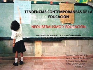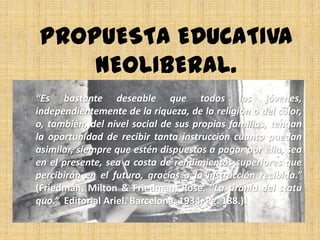 El documento discute las tendencias neoliberales en la educación contemporánea en España. Aboga por una mayor privatización y elección de escuelas, una gestión más empresarial de la educación con menos gasto público, y una mayor importancia dada a los resultados académicos en lugar de la cantidad de escolarización. Critica el gasto actual y aboga por invertir de manera más eficiente para mejorar la calidad de la educación.