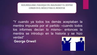 Este documento analiza el contexto político y económico de México en las últimas décadas bajo el neoliberalismo y la llegada del gobierno de López Obrador en 2018. Señala que aunque López Obrador se presentó como una alternativa al neoliberalismo, en realidad ha continuado con políticas neoliberales y no ha cumplido sus promesas de campaña. El crecimiento económico ha sido menor que en gobiernos previos y la desigualdad sigue siendo alta, lo que sugiere que el gobierno en