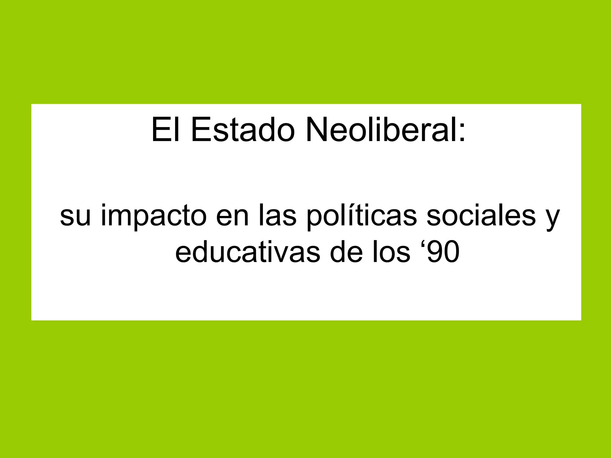 El documento describe el neoliberalismo como una continuación del liberalismo clásico que promueve una concepción individualista y competitiva del hombre y la sociedad. Surge en los años 70 ante la crisis económica y la amenaza del socialismo. Líderes como Hayek y Friedman defendieron el libre mercado. Chile aplicó reformas neoliberales drásticas bajo Pinochet mediante la privatización, el desempleo masivo y la represión sindical. En nuestro país, las políticas sociales neoliberales se caracterizaron por la privatización, la focaliz