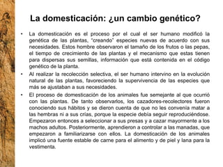 El documento resume los principales cambios que ocurrieron durante el período Neolítico, incluyendo la domesticación de plantas y animales que llevó al desarrollo de la agricultura y la ganadería, lo que permitió el surgimiento de asentamientos sedentarios más grandes. También se mencionan nuevas herramientas, técnicas y la aparición de una estratificación social más compleja con diferentes roles y formas de gobierno.