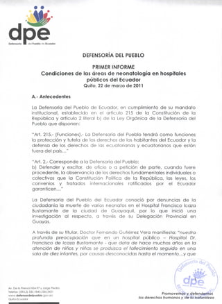 Este documento presenta un informe preliminar sobre las condiciones de las áreas de neonatología en hospitales públicos ecuatorianos. La Defensoría del Pueblo realizó investigaciones en varios hospitales luego de denuncias sobre muertes de neonatos. El informe describe las acciones tomadas por la Defensoría, incluyendo visitas a las salas de neonatología y solicitudes de información al Ministerio de Salud.