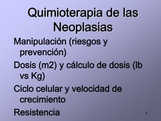 Este documento describe diferentes tipos de fármacos quimioterapéuticos utilizados para tratar neoplasias, incluyendo fármacos alquilantes, antimicrotúbulos, que interactúan con la topoisomerasa, análogos de platino y antimetabolitos. Explica sus mecanismos de acción, formas de administración, toxicidades y consideraciones sobre su uso. También cubre conceptos como quimioterapia combinada, resistencia a medicamentos y educación al paciente.