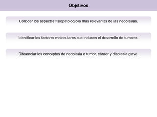 Este documento trata sobre las neoplasias y la patología general. Define conceptos como neoplasia, tumor, cáncer y displasia. Explica las características de las neoplasias benignas y malignas, y cómo se clasifican y nombran los tumores según su origen y tipo celular. También cubre temas como la diferenciación celular, la anaplasia y la nomenclatura de lesiones precancerosas.