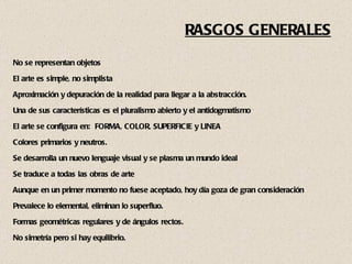 El documento describe el movimiento artístico y arquitectónico conocido como Neoplasticismo o De Stijl. Sus características incluyen el uso de formas geométricas simples, colores primarios y superficies planas sin detalles decorativos. Artistas como Piet Mondrian y arquitectos como Gerrit Rietveld crearon obras emblemáticas de este estilo que buscaba la abstracción y equilibrio a través de la forma y el color.
